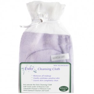 Exfo Cleansing Cloth mit warmem Wasser zusammen mit Rosacea Care Ultramild Cleanser oder Mild Oatmeal Cleanser einseifen bevor Sie Ihr Gesicht waschen. Der Handschuh macht den Rest.
